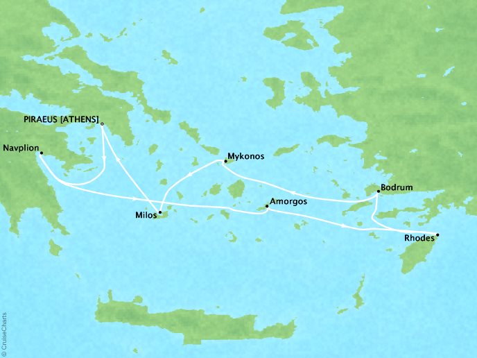 DAY 1 | Piraeus, Greece — 6:00 PM DAY 2 Nauplion, Greece 8:00 AM 5:00 PM DAY 3 Amorgós, Greece 8:00 AM 7:00 PM DAY 4 Rhodes, Greece 8:00 AM 10:00 PM DAY 5 Bodrum, Turkey 8:00 AM 9:00 PM DAY 6 Mykonos, Greece 8:00 AM 7:00 PM DAY 7 Mílos, Greece 8:00 AM 7:00 PM DAY 8 Piraeus, Greece 6:00 AM