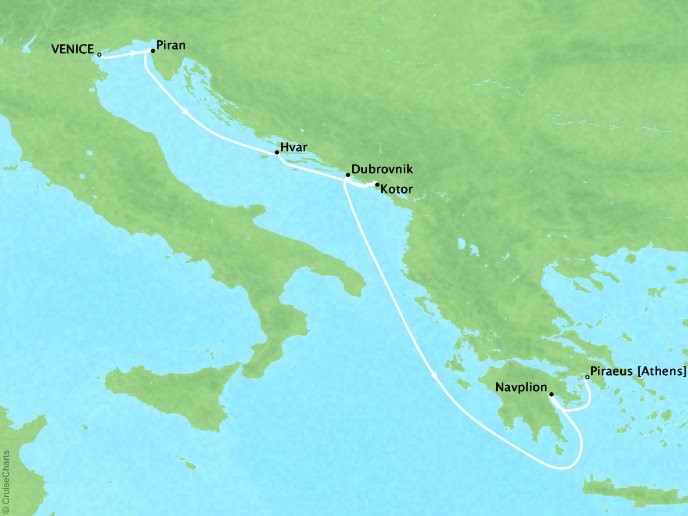 DAY 1 | Venice, Italy 6:00 PM DAY 2 Piran, Slovenia 8:00 AM 4:00 PM DAY 3 Hvar, Croatia 8:00 AM 10:00 PM DAY 4 Kotor, Montenegro 8:00 AM 5:00 PM DAY 5 Dubrovnik, Croatia 8:00 AM 4:00 PM DAY 6 Day-at-Sea DAY 7 Nauplion, Greece 9:00 AM 7:00 PM DAY 8 Piraeus, Greece 6:00 AM
