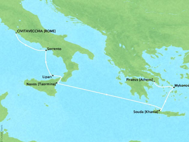 DAY 1 | Civitavecchia, Italy 6:00 PM DAY 2 Sorrento, Italy 8:00 AM 7:00 PM DAY 3 Lipari, Italy 9:00 AM 8:00 PM DAY 4 Taormina, Italy 8:00 AM 8:00 PM DAY 5 Day-at-Sea DAY 6 Souda, Greece 8:00 AM 7:00 PM DAY 7 Mykonos, Greece 8:00 AM 10:00 PM DAY 8 Piraeus, Greece 6:00 AM