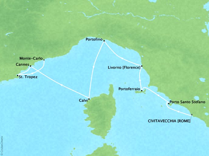 DAY 1 | Civitavecchia, Italy 6:00 PM DAY 2 Porto Santo Stefano, Italy 8:00 AM 6:00 PM DAY 3 Portoferraio, Italy 8:00 AM 6:00 PM DAY 4 Livorno, Italy 8:00 AM 11:00 PM DAY 5 Portofino, Italy 8:00 AM 9:00 PM DAY 6 Calvi, France 9:00 AM 7:00 PM DAY 7 Cannes, France 8:00 AM 10:00 PM DAY 8 St. Tropez, France 8:00 AM 11:00 PM DAY 9 Monte-Carlo, Monaco 7:00 AM