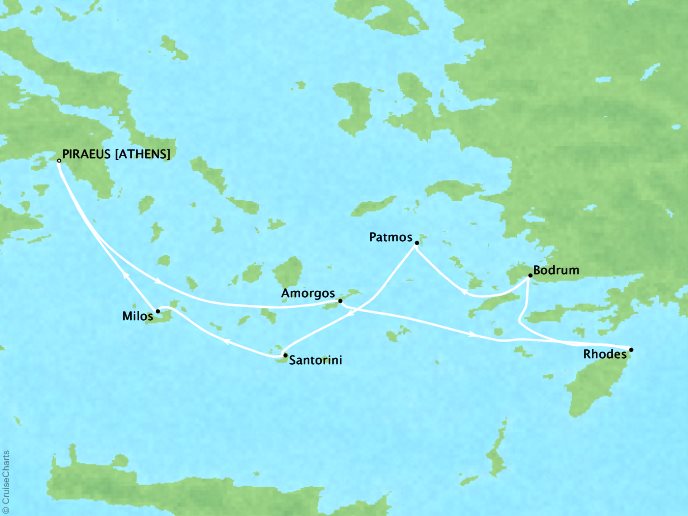 DAY 1 | Piraeus, Greece 6:00 PM DAY 2 Amorgos, Greece 8:00 AM 6:00 PM DAY 3 Rhodes, Greece 8:00 AM 9:00 PM DAY 4 Bodrum, Turkey 8:00 AM 7:00 PM DAY 5 Patmos, Greece 8:00 AM 7:00 PM DAY 6 Santorini, Greece 8:00 AM 9:00 PM DAY 7 Mílos, Greece 8:00 AM 7:00 PM DAY 8 Piraeus, Greece 6:00 AM